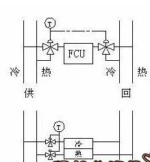 四條管道分別采用冷熱水供應(yīng)管和回水管系統(tǒng)。進出水管設(shè)轉(zhuǎn)換控制閥,主要用于全年空調(diào)系統(tǒng),即隨時有冷熱源,冷熱水量由溫控閥調(diào)節(jié)。