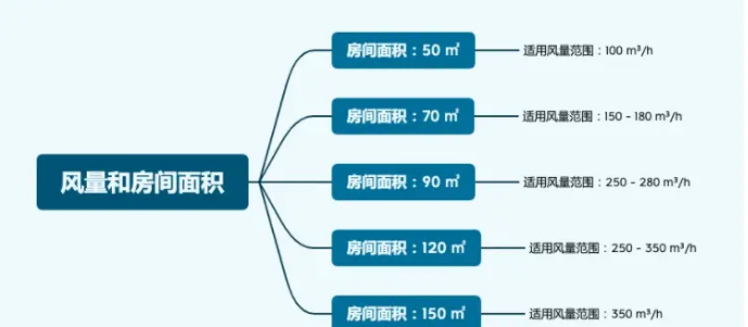 一般臥室按 50 平米以內(nèi)來算的話,得要至少 100 風(fēng)量的機(jī)子,150 - 180 風(fēng)量大概可以覆蓋 70 平米以內(nèi)的面積,以此類推,具體標(biāo)準(zhǔn)可以參考這個圖。